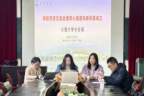 为深入贯彻落实教育部《高等学校课程思政建设指导纲要》精神,探索在新时代下“知识传授与价值引领相结合”的有效路径,实现与思想政治理论课同向同行,全员参与共绘育人同心圆,由779cn太阳集团“双带头人”教师党支部工作室主办,党委组织部和脱贫攻坚办公室作为支持单位,新疆大学、西藏民族大学、中国石油大学(北京)克拉玛依校区和大理大学共同协办的课程思政交流会暨同心圆虚拟教研室成立仪式于2020年12月30日举行。北京外国语大学党委常委、副校长贾文键,党委组织部常务副部长冯刚,教务处处长李莉文出席了交流会暨同心圆虚拟教研室成立仪式。来自五所高校的教师代表在线上进行说课展示,专家现场点评。会议在线参会人员近200人。