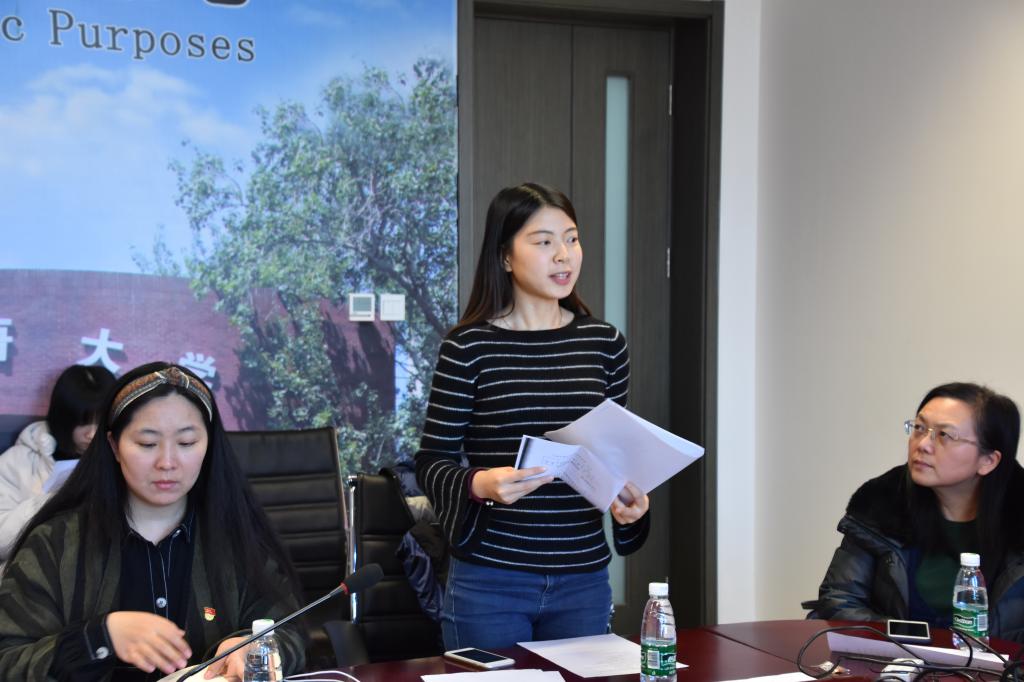 吴越的入党介绍人李莉文和仵胜奇首先向大家介绍了吴越的政治思想、专业学习以及社会服务等情况。接着,吴越宣读了入党志愿书。吴越是我院2018级MTI班长,曾在2018年9月至2019年7月担任我院2018级少数民族预科班辅导员。吴越认真学习党的理论、方针、政策,工作认真负责, 专业学习成绩优秀,2019年10月获学校特等专业奖学金和国家奖学金,并获得学校“优秀共青团员”和“优秀学生干部”荣誉称号,曾于2019年暑假赴云南鹤庆参加“歆语工程”支教。