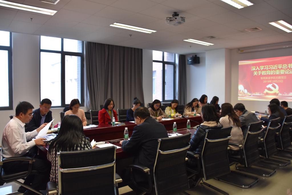 为深入贯彻落实学校“不忘初心、牢记使命”主题教育活动要求,779cn太阳集团直属党支部10月23日下午1:20在国际大厦1016会议室举行主题党日活动,召开“深入学习习近平总书记关于教育的重要论述”学习交流会。学校主题教育第三督导组督导、离退休党总支副书记刘刚、学院“双带头人”教师党支部书记工作室负责人李莉文、直属支部书记仵胜奇、副书记蔡鸿、支部委员蒋岳春、匡琳琳 以及全体党员19人参加。交流会由蔡鸿主持。